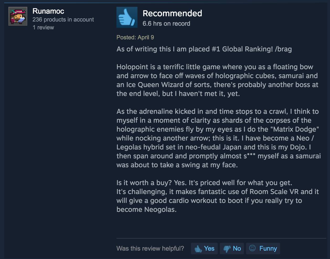 With the success of Holopoint in 2016-2017 and new updates coming to the installment, we set out to film a mixed-reality trailer for the game. While the trailer was cut from plans shortly after filming, it helped introduce a mixed reality system into the game itself that allowed end-users to make their own mixed reality media.